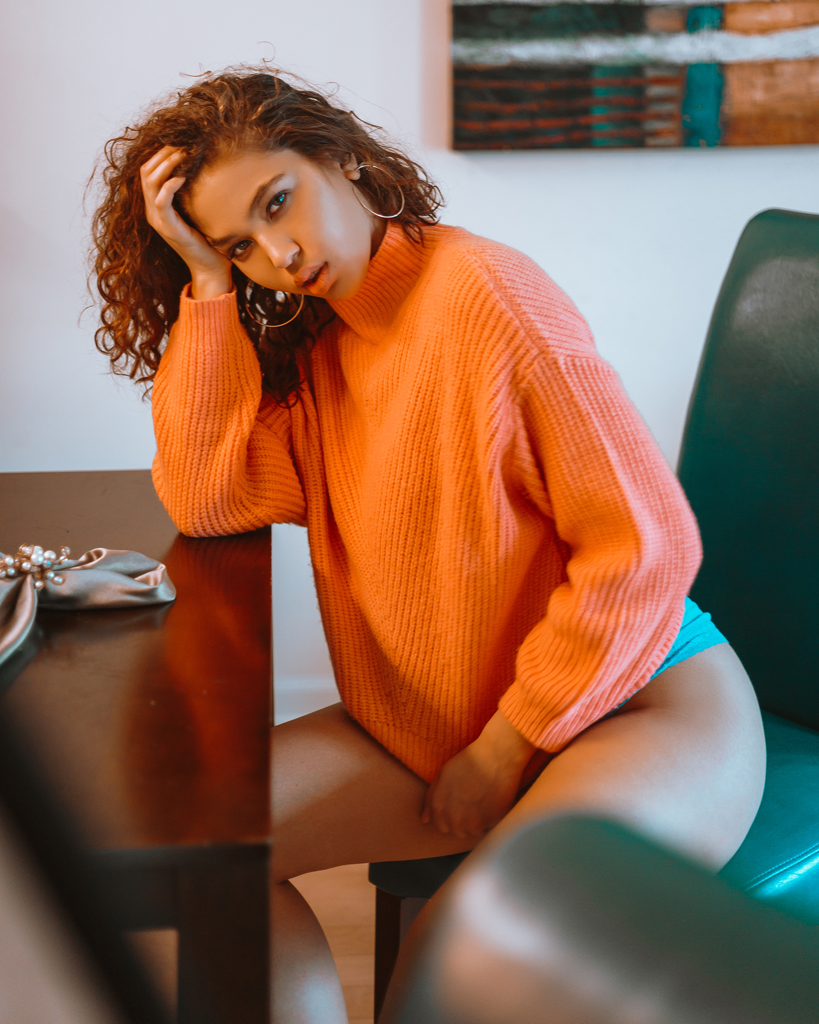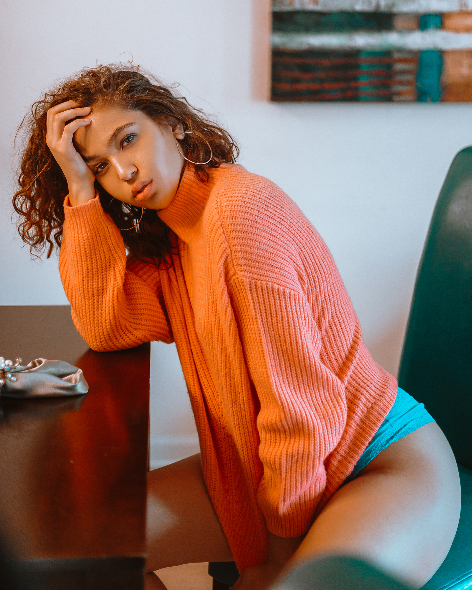 The last installment in the recent series with Jullian. We finish off with a fun and sensual set, packed with color and good vibrations. Her radiant smile and soft curves blend well as well with the color gradient of the room and her sweater. Enjoy!